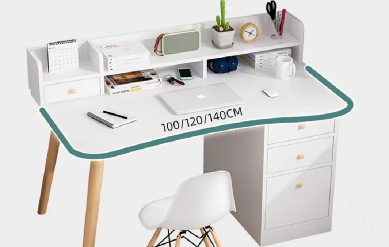 Selanjutnya, bagian samping kanannya terdapat tiga laci yang bisa berperan sebagai lemari untuk menyimpan berbagai keperluan seperti dokumen hingga alat tulis. Kemudian di bagian bawah furnitur ini juga terdapat rak terbuka untuk menyimpan map dokumen, buku, dan lainnya.